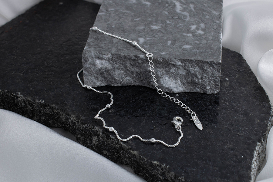 TORNOZELEIRA BANHADO EM PRATA LEVE, ELO VENEZIANA 0,80mm, 22cm COMPRIMENTO, EXTENSOR 5cm COMPRIMENTO, COM ESFERAS 2,50mm