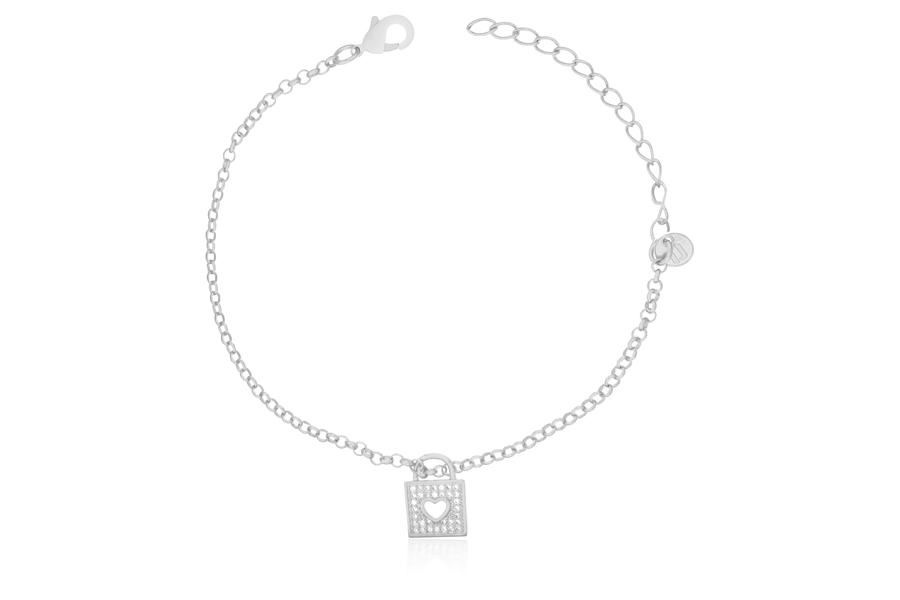 PULSEIRA BANHADA EM RÓDIO BRANCO, TRIPLA, 15cm COMPRIMENTO, EXTENSOR 5cm COMPRIMENTO E CORAÇÃO 14mm ALTURA