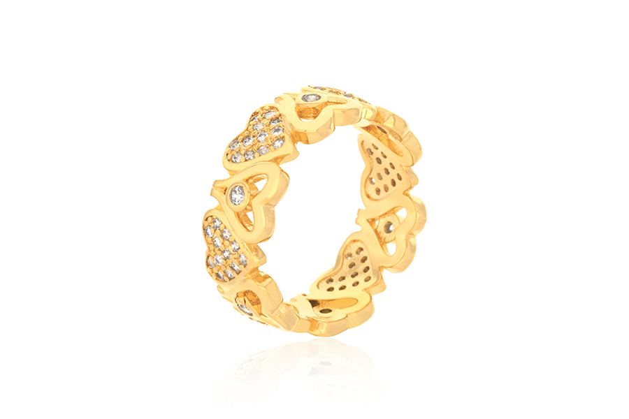 ANEL BANHADO EM OURO, ALIANÇA COM 31 ZIRCÔNIAS, TODO CRAVEJADO, COM DOIS CORAÇÕES, PARA QUALQUER COR DE PEDRA
