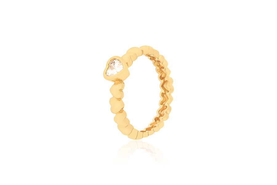 ANEL BANHADO EM OURO, ALIANÇA COM 31 ZIRCÔNIAS, TODO CRAVEJADO, COM DOIS CORAÇÕES, PARA QUALQUER COR DE PEDRA